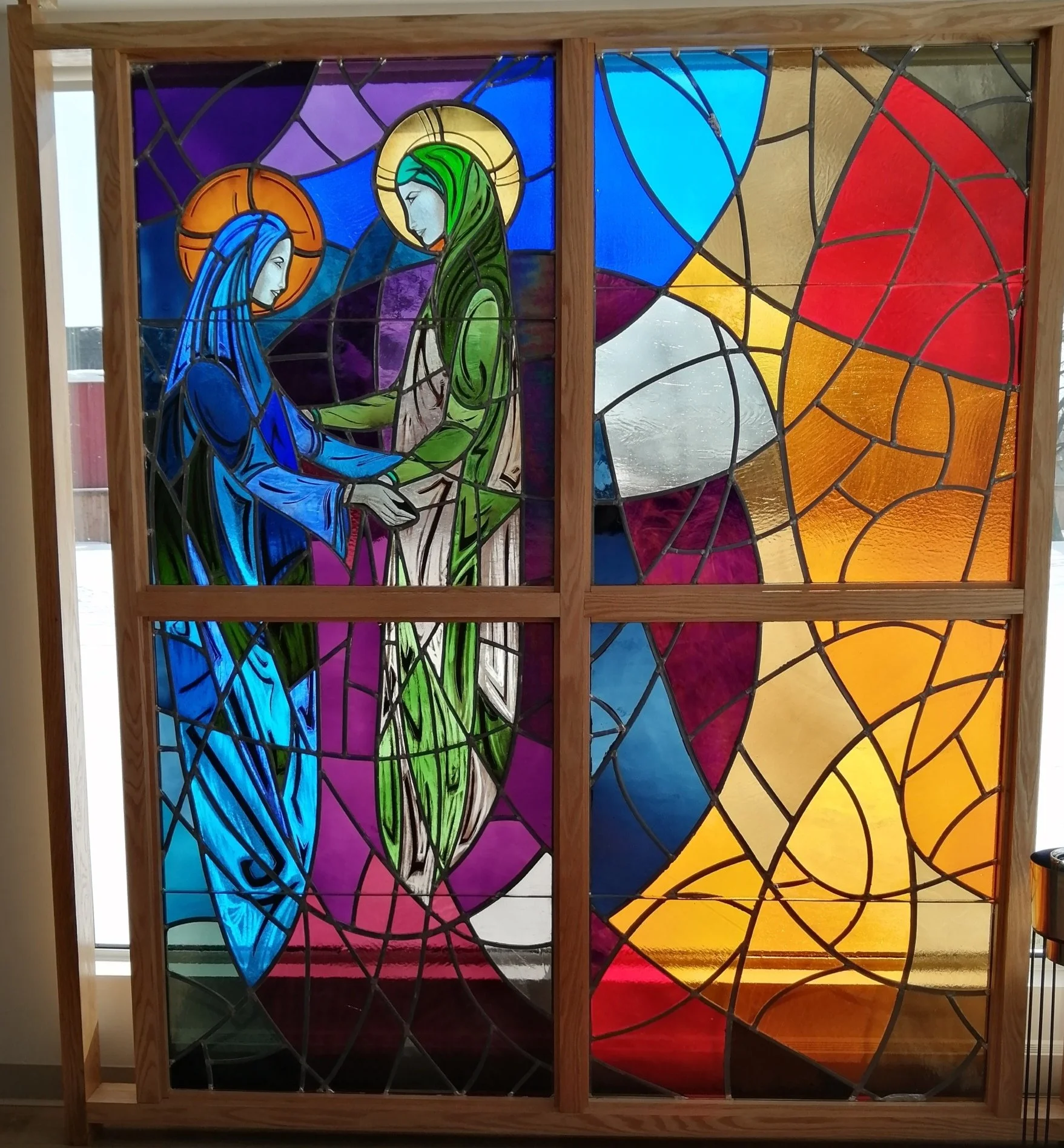 The four stained glass windows are a gift to this Monastery building from the Sisters of Our Lady of the Missions. Thank you! The latest window is of the Visitation of Mary to her cousin Elizabeth.